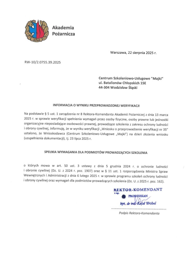 Centrum Szkoleniowo-Usługowe „Majki” otrzymało pozytywną weryfikację Akademii Pożarniczej w zakresie prowadzenia szkoleń określonych w Rozporządzeniu Ministra Spraw Wewnętrznych i Administracji z dnia 6 lutego 2025 r. w sprawie programów szkoleń z zakresu ochrony ludności i obrony cywilnej oraz wymagań dla podmiotów prowadzących szkolenia, zwanym dalej „rozporządzeniem” (Dz. U z 2025 r. poz. 162).